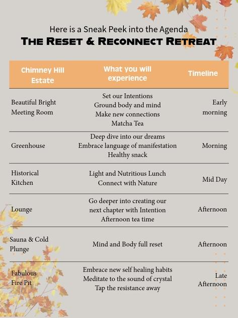 « The Reset and Reconnect Retreat was a beautiful experience that truly lived up to its name. I felt both refreshed and deeply grounded, with time to pause, reflect, and recharge. The sessions were thoughtfully designed, and the balance of rest and inspiration left me feeling renewed. I walked away not only with clarity but also with tools and practices I can carry into my daily life. » - Meredani S., NJ